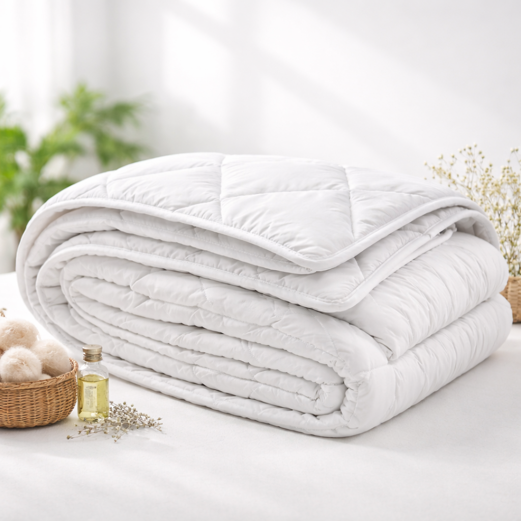Jede Decke wird in Europa handgefertigt und mit natürlichem Thermalwasser gereinigt – ohne Chemikalien, ohne Zusätze, nur reine Natur. Sie ist plastikfrei, hypoallergen und unterstützt ein trockenes, ausgeglichenes Schlafklima. Her bir yorgan Avrupa’da el yapımı üretilir ve doğal termal su ile temizlenir. Kimyasal ve katkı maddesi yoktur, tamamen doğaldır. Plastik içermez, alerji dostudur ve dengeli bir uyku ortamı sağlar.